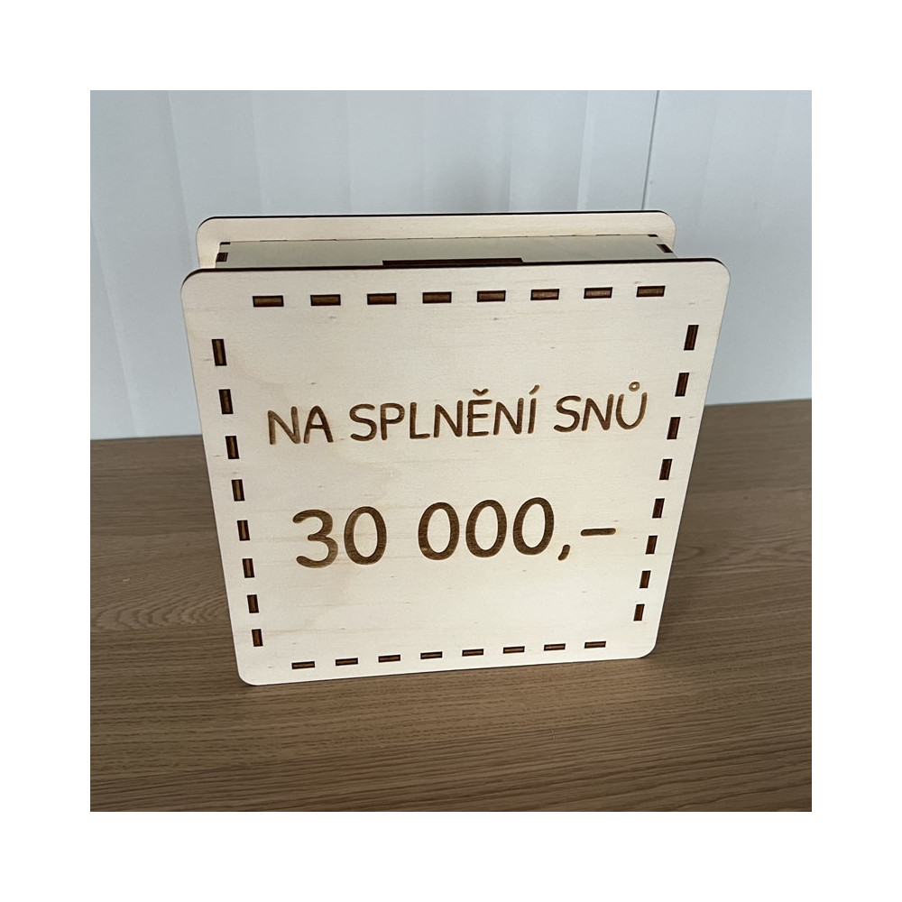 Dřevěná šetřící pokladnička "Na splnění snů 30 000,-" je skvělým pomocníkem pro zábavné a efektivní spoření. Pokladnička obsahuje tabulku s částkami 50,100, 200, 500 Kč, které si můžete postupně škrtnout podle vašich naspořených financí.